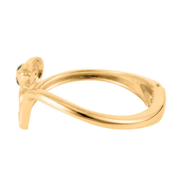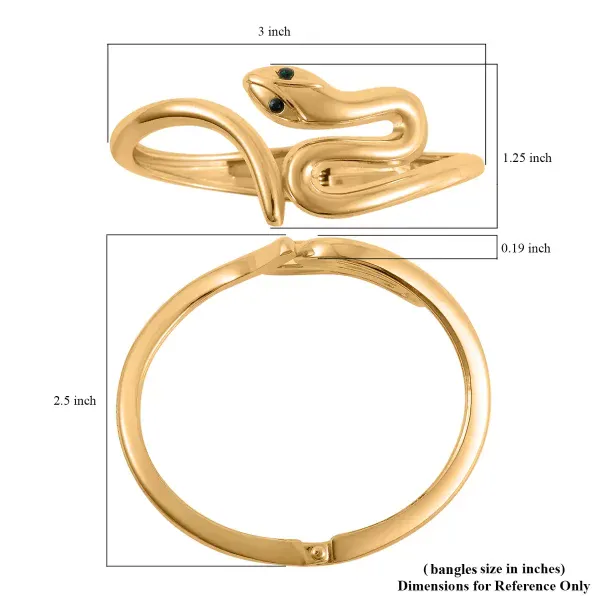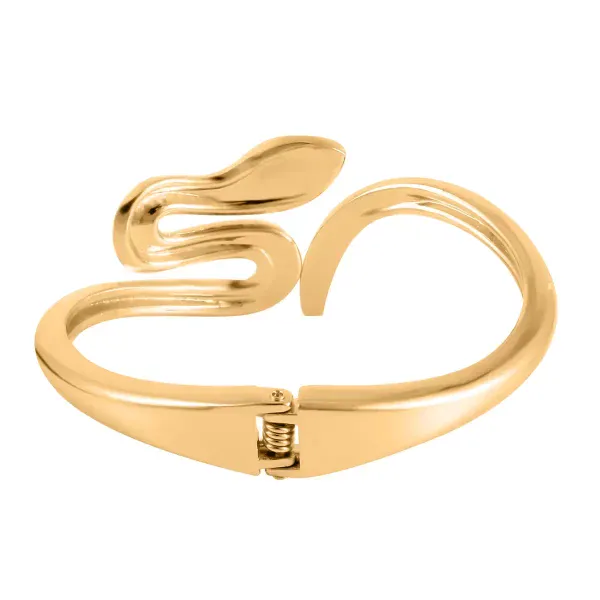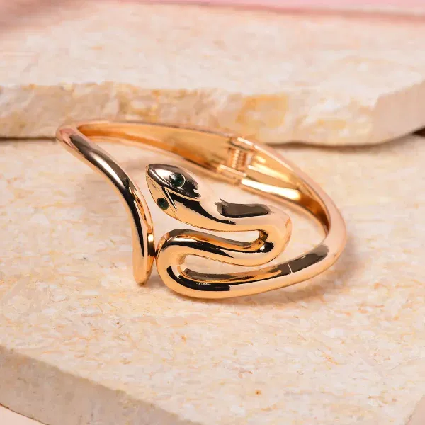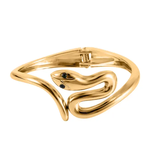 The Golden Serpent Bangle features a sculpted snake silhouette finished in high-polish goldtone metal. Detailed with black Austrian crystal eyes, this hinged bracelet blends modern minimalism with powerful symbolism.