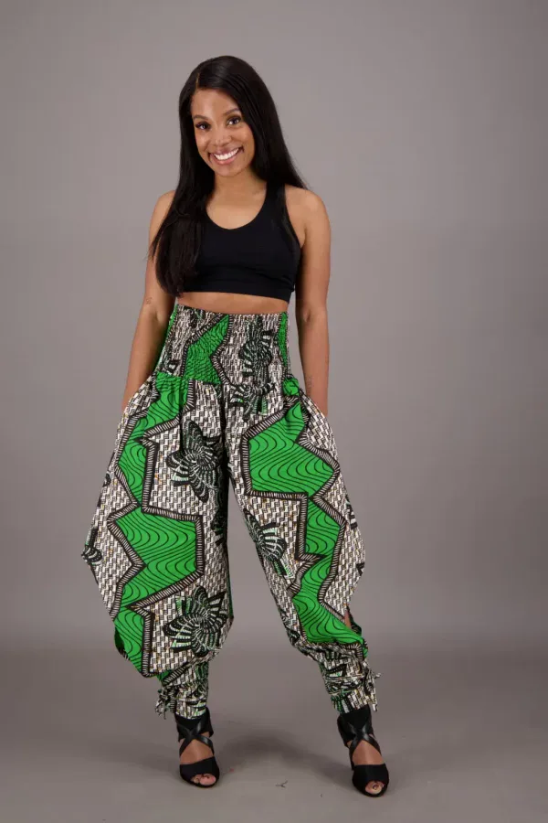 Make a statement with the Emerald Echo Harem Pants Set, featuring striking green and earth-toned patterns that celebrate African craftsmanship. Designed with a high smocked waist, roomy harem silhouette, and ankle ties for a secure fit, these pants are made to move with you from lounge days to festival nights.