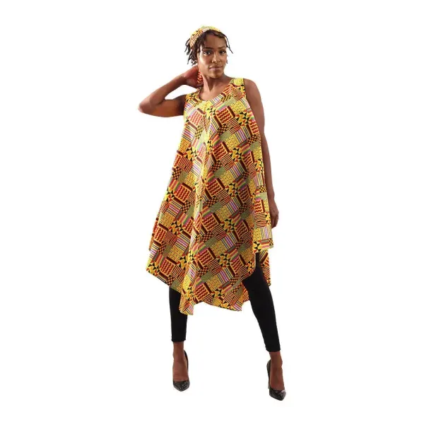 The flattering scoop neckline and flowy, asymmetrical silhouette offer all-day comfort, whether you’re dressing up for a cultural event or keeping it casual with leggings. A matching head wrap adds the final Afro-chic touch to this versatile statement piece.