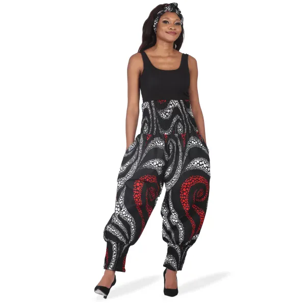 Step into bold, effortless style with our Midnight Swirl Harem Pants, featuring a dramatic black, white, and red swirl pattern inspired by African wax prints. These statement pants are crafted for both comfort and flair, with a wide elastic waistband and gathered ankle cuffs to create the perfect harem silhouette.