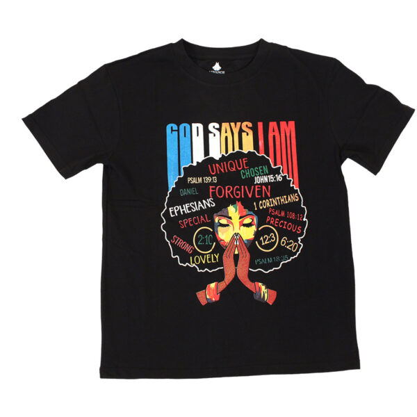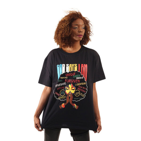 Wear your beliefs in trendy fashion with this God Says I am T-Shirt. The stunning black cotton t-shirt features a bold colorful design centered around the phrase “I AM.” Spread your message of faith with a fashion statement that is guaranteed to make an impact. Available in all sizes from M to 3X. Tagless tee. 60% Cotton and 40% Polyester. Made in India. C-T029