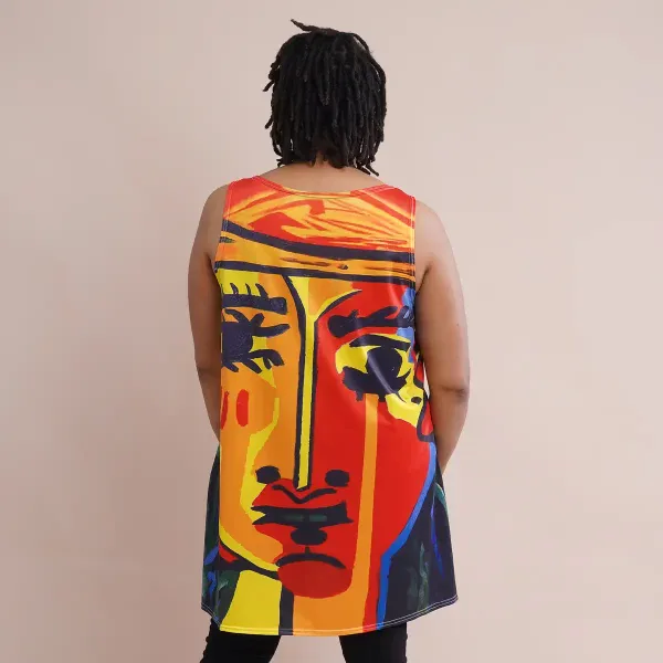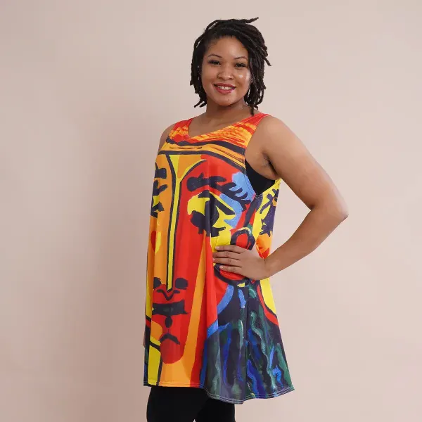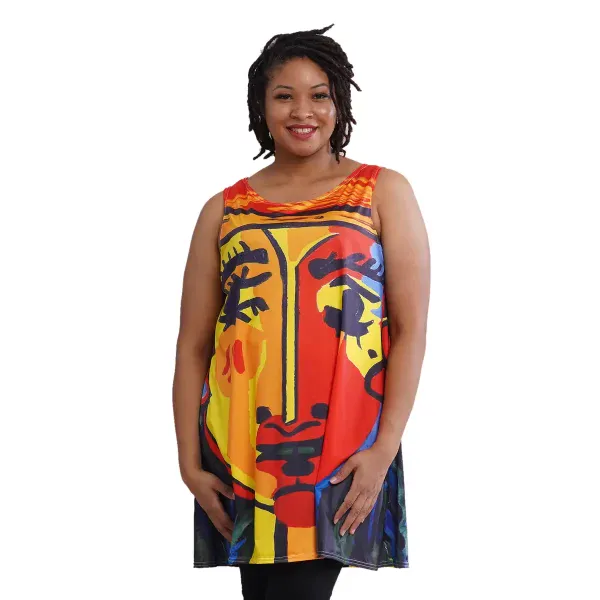 Turn heads in this striking A-Line Tunic featuring a bold abstract face design in rich red, gold, and navy tones. Crafted from lightweight polyester fabric, this sleeveless piece offers breathable comfort with standout artistic flair.
