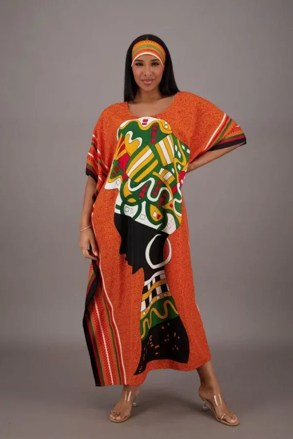 Command attention in the Nubian Crown Kaftan—a celebration of heritage, beauty, and bold expression. This vibrant silhouette features the regal profile of an African woman adorned in colorful tribal patterns, set against a warm orange backdrop with rich red, green, and black accents.