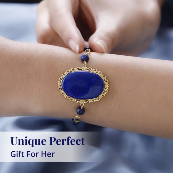 Elevate your wrist with the timeless elegance of the Karis Collection Lapis Lazuli Bracelet. Designed with a bold 30x20mm oval lapis lazuli centerpiece framed in intricate gold scrollwork, this bracelet blends artisan craftsmanship with modern paperclip chain styling.