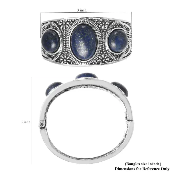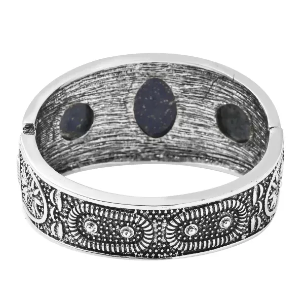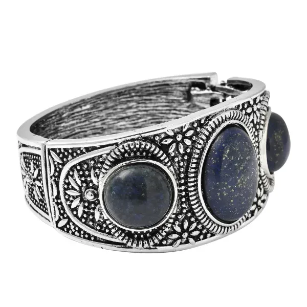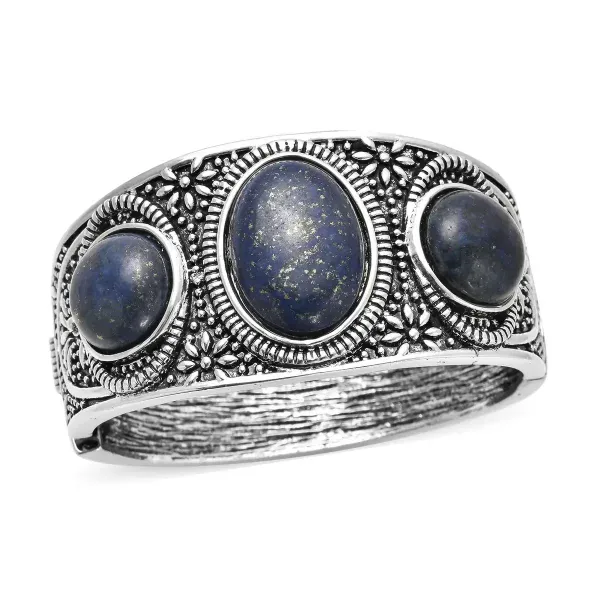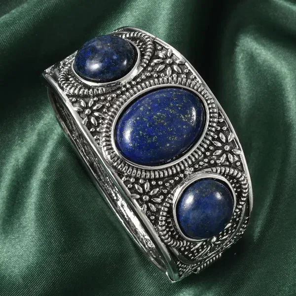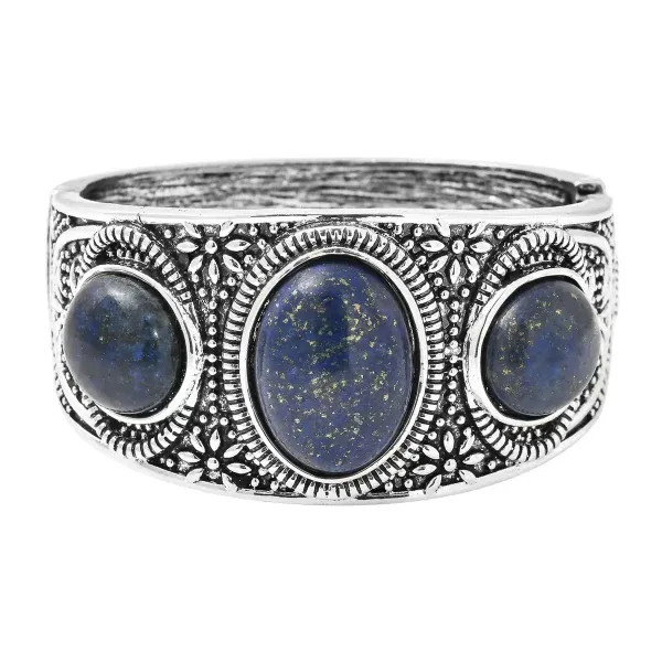 Bold heritage meets timeless elegance in this Lapis Lazuli Three-Stone Bangle Bracelet. Featuring three genuine lapis lazuli gemstones set in intricately detailed oxidized silvertone brass, this hinged bangle delivers artisan craftsmanship with regal presence.