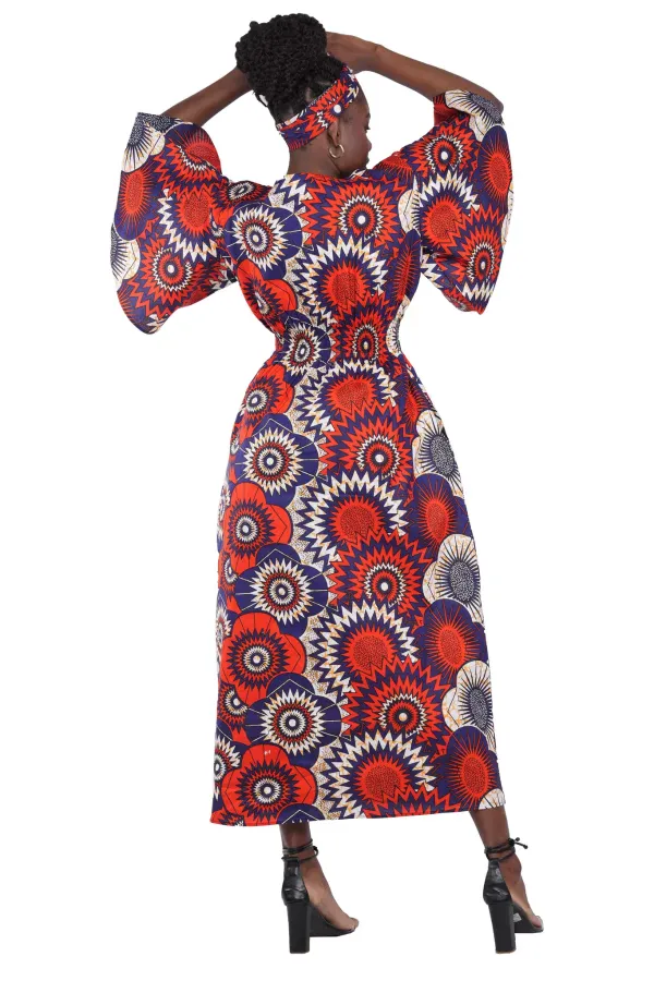 Crafted from 100% cotton, this eye-catching red, navy, and white African wax print dress features a flattering smocked waist and flowing bell sleeves. Designed to fit US women’s sizes Small to Large, it offers a graceful 57″ length and includes a matching headwrap for a complete look.