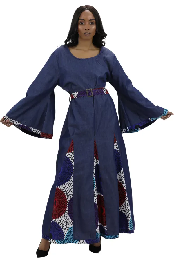 Elevate your everyday with the Denim Harmony Maxi Dress, where timeless denim meets vibrant African wax print for a look that’s effortlessly bold and beautifully refined. Crafted from 100% breathable cotton, this full-length dress features a flattering shirred waistline and dramatic bell sleeves for added flair and comfort.