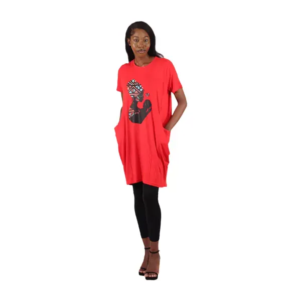 Celebrate comfort and culture in the Mother’s Love T-Shirt Dress. This bold red t-shirt dress features a heartfelt graphic of an African mother in a traditional headwrap cradling her baby, symbolizing the unbreakable bond between mother and child. With its relaxed fit, scoop neckline, short sleeves, and deep side pockets, it’s perfect for casual days, lounging, or as a stylish beach cover-up.
