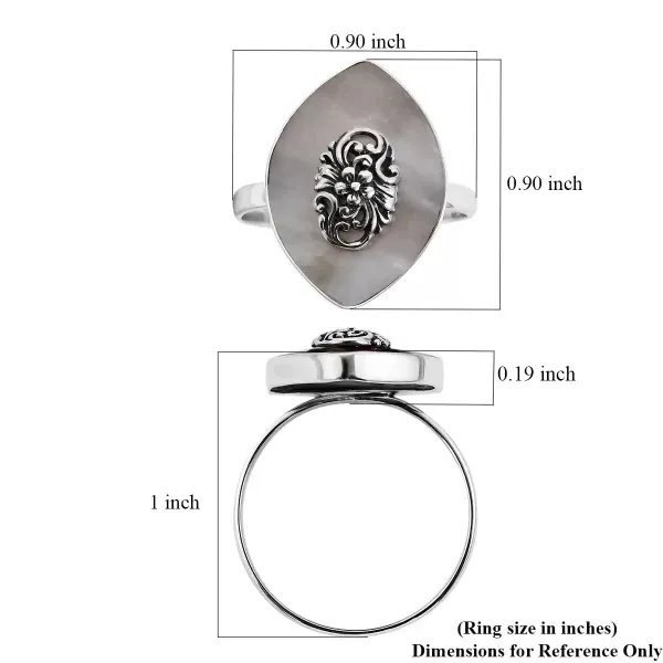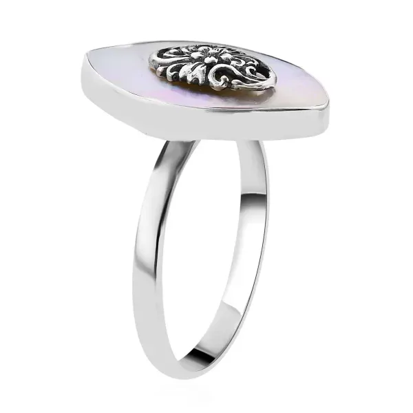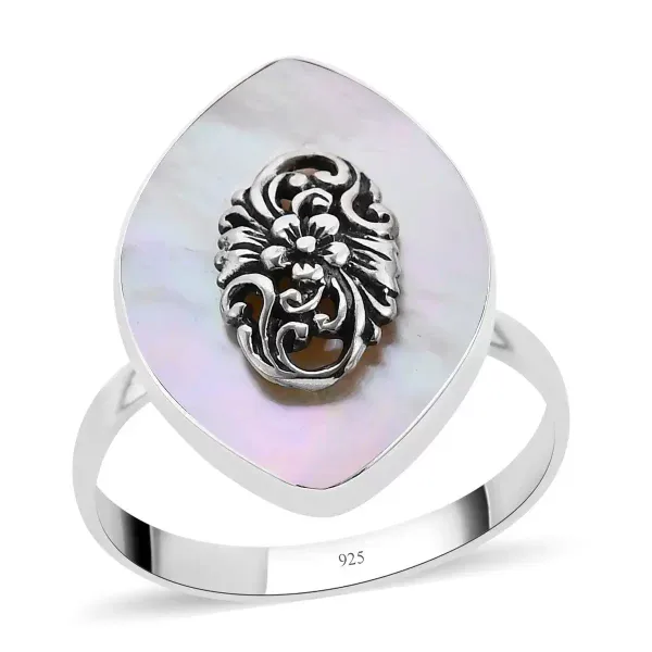 A bezel-set fancy-shaped mother of pearl centerpiece is gently overlaid with intricate floral metalwork, creating a romantic, sculptural silhouette. The polished 925 sterling silver band enhances its luminous sheen while maintaining timeless wearability.