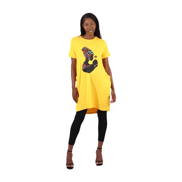 Bright, bold, and full of meaning—the Mother’s Love T-Shirt Dress in yellow is a joyful celebration of motherhood. Featuring a vibrant silhouette of an African mother cradling her baby in a traditional headwrap, this design radiates warmth and connection. The relaxed fit, soft fabric, and handy side pockets make it perfect for sunny days, casual outings, or as a chic beach cover-up.