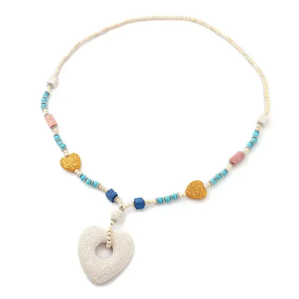 Multi-Color Lava Beads & Howlite Heart Charm Necklace – 28 Inch Gemstone Beaded Necklace