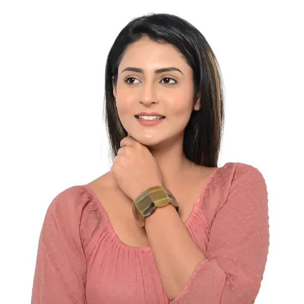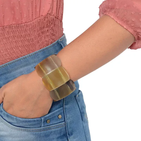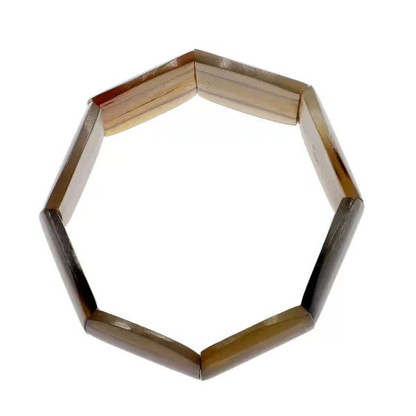 This genuine buffalo horn bracelet features naturally polished, cushion-shaped horn segments arranged in a stretchable, comfortable fit. Each link is hand-set to highlight the rich grain and variation of real buffalo horn, making every piece unique.