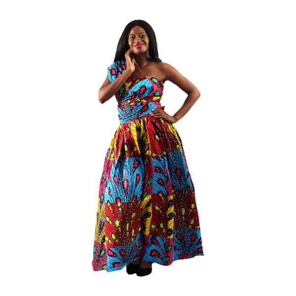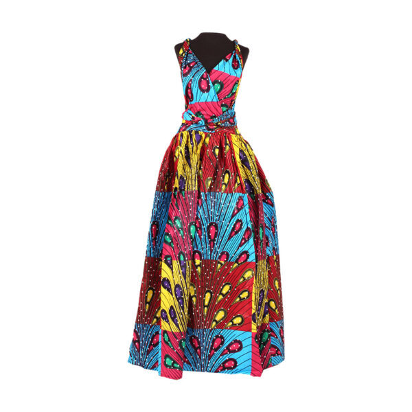Radiate confidence in the Peacock Prism Infinity Dress—a bold and vibrant showstopper that celebrates versatility and African-inspired beauty. Featuring a striking multi-color peacock feather print in vibrant red, blue, green, yellow, and purple, this floor-length dress is designed to transform with your mood and the occasion.
