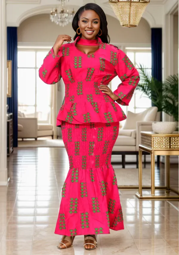 Elevate your wardrobe with this vibrant Green and Pink African Print 2-Piece Skirt Set, designed to celebrate culture with a modern twist. Featuring bold geometric patterns in vivid green on a rich pink background, this set is both elegant and empowering. The long-sleeve top is detailed with a stylish smocked collar and a flattering peplum cut that accentuates the waist. (Fits sizes Small to XL)