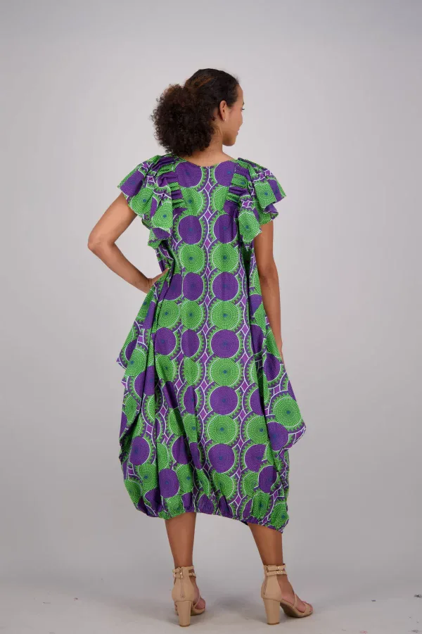 Crafted from soft, breathable 100% cotton, the dress features an eye-catching circular print in shades of purple and green. The relaxed, flowy silhouette flatters all body types, while flutter sleeves and roomy side pockets add a touch of practicality and charm.