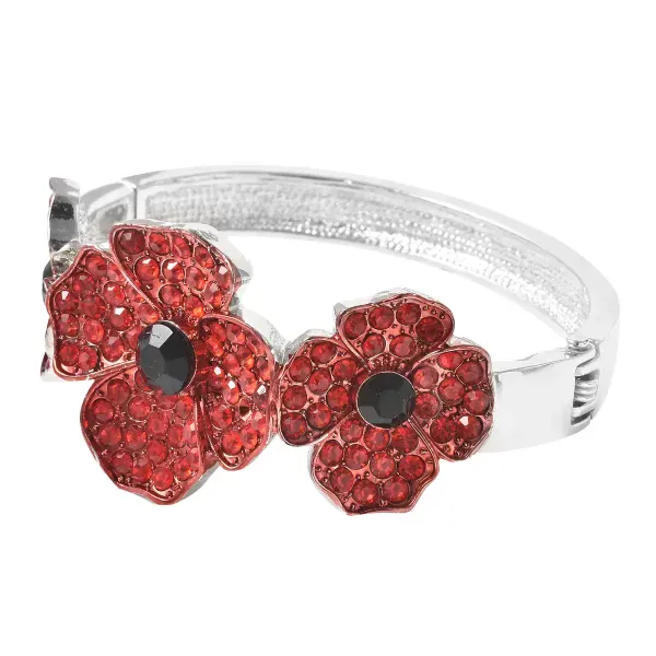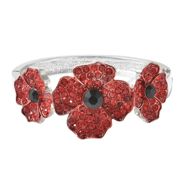 The Crimson Bloom Poppy Bangle is a striking floral statement bracelet designed to command attention. Featuring three dimensional poppy flowers set with shimmering red Austrian crystals and dramatic black centers, this piece blends romance with strength in a powerful silhouette.
