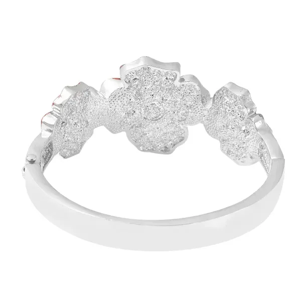 Resting on a polished silvertone brass frame, the sculpted floral design wraps the wrist in brilliance and texture, making it perfect for evening elegance or standout daytime styling.