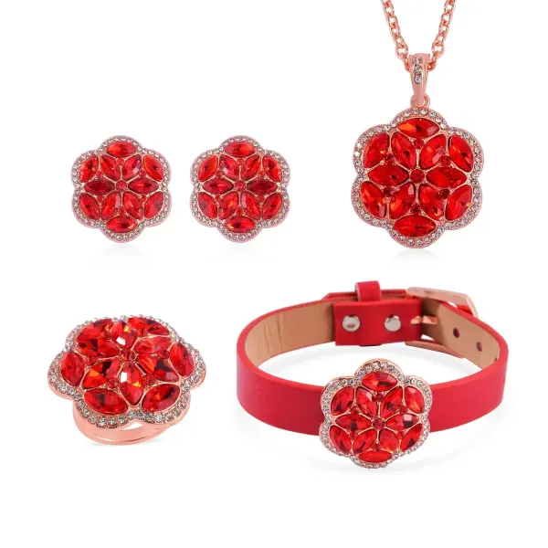 Make a bold entrance with this radiant red Austrian crystal jewelry set. Designed in a sculpted marquise-cut floral motif, this coordinated 5-piece collection delivers dramatic sparkle, rich color, and polished elegance.