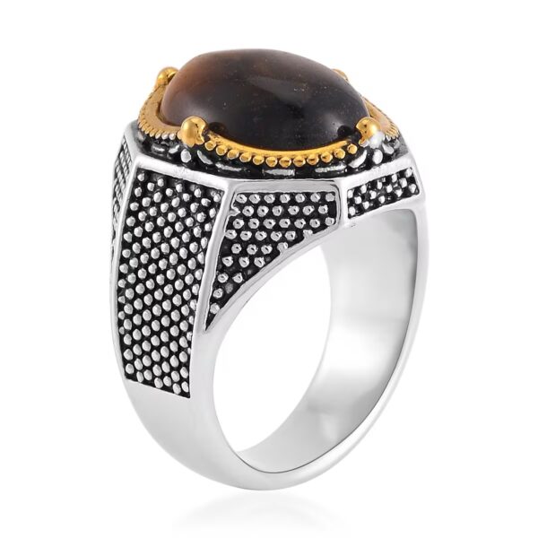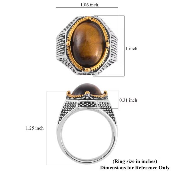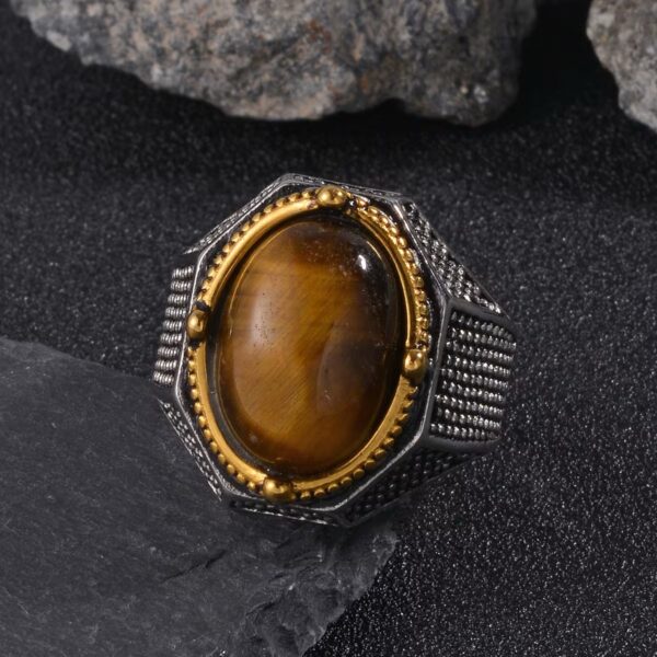 At its center rests a polished natural yellow tiger’s eye cabochon, known for its rich golden bands and powerful presence. The textured stainless steel shank delivers a strong architectural feel, while the ION-plated yellow gold bezel adds refined contrast.