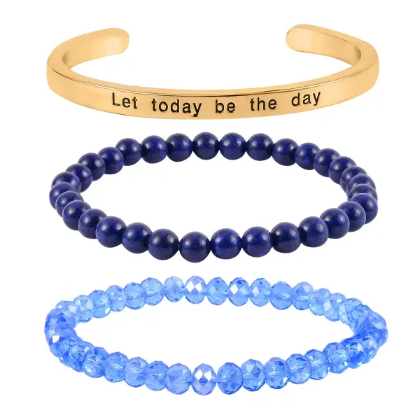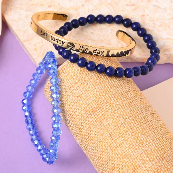 Elevate your stack with this Lapis Lazuli bracelet set featuring two stretch bracelets and one engraved goldtone cuff. Designed with natural lapis lazuli beads, faceted blue glass crystals, and an inspirational cuff engraved with “Let today be the day,” this 3-piece bracelet set blends bold color with meaningful detail.