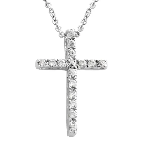 This simulated diamond cross necklace combines timeless beauty with meaningful Christian symbolism. Designed with 16 sparkling lab-created stones totaling 1.25 carats, this elegant cross pendant necklace shines with brilliance and clarity.