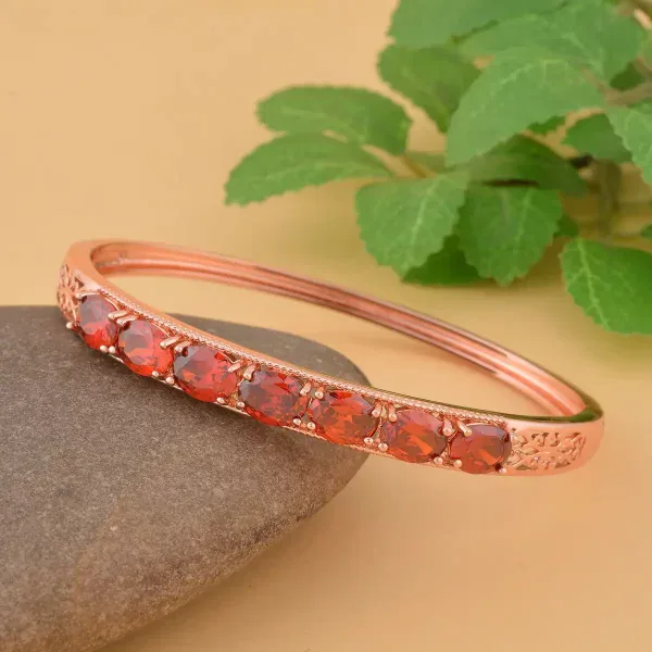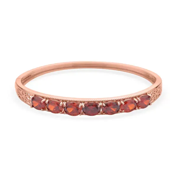 Elegant. Fiery. Unforgettable. This Radiant Rose bangle brings rich red sparkle to a sleek rosetone silhouette, featuring seven oval-cut simulated diamonds set across the top for a refined statement that’s easy to wear day or night.