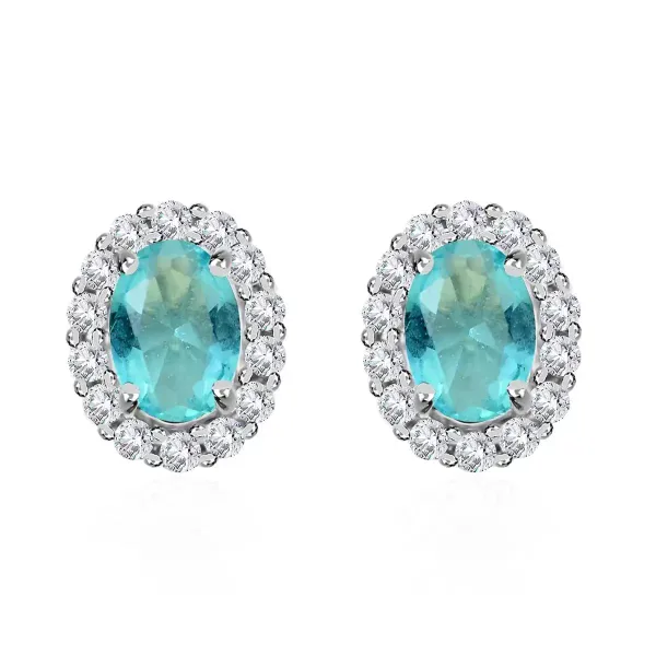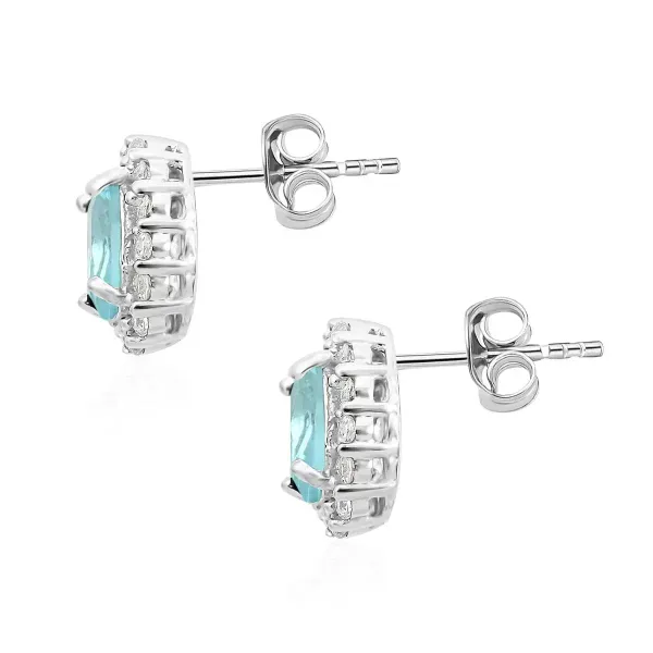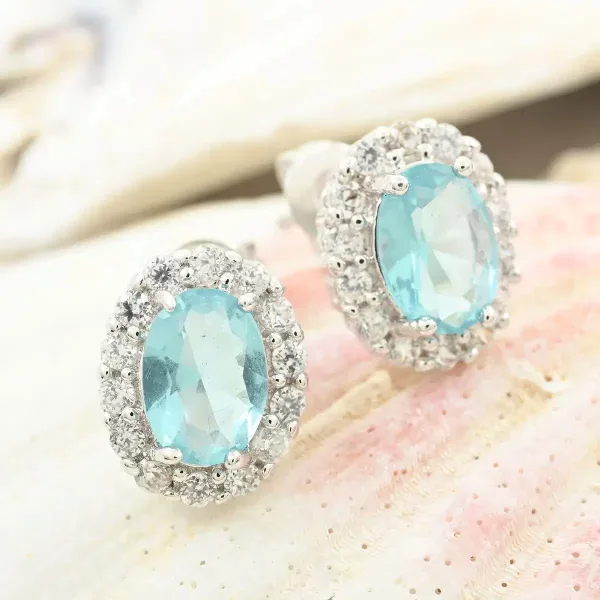 Bring cool-toned elegance to your jewelry collection with these Sky Luxe Oval Halo Stud Earrings. Each earring features a 7×5 mm simulated sky blue center stone framed by a halo of sparkling colorless stones for refined brilliance.