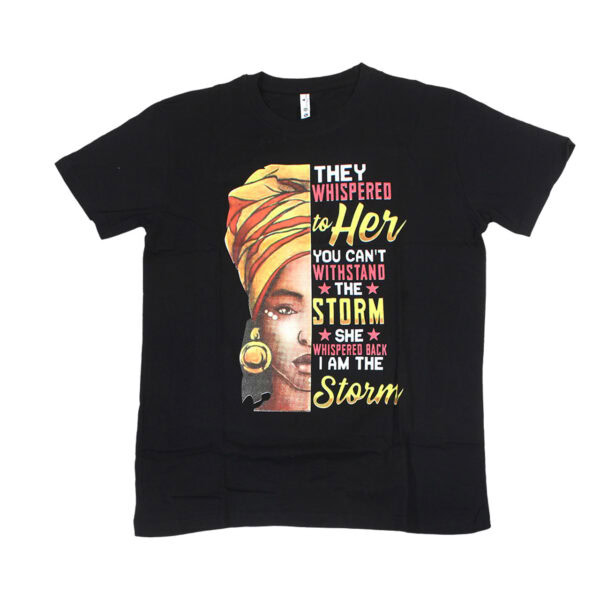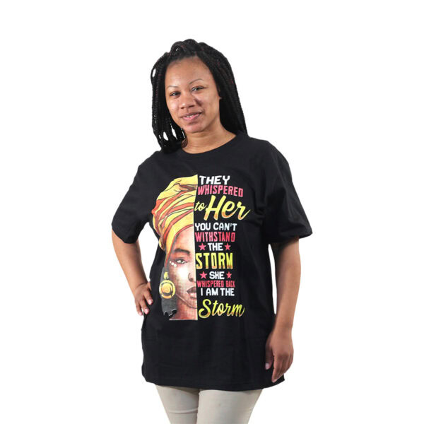 Celebrate your power with this bold and stylish Storm T-Shirt. The t-shirt is black with a crew neck and short sleeves. It features a two-sided design on the front. One side is a half of the head and shoulders of an African woman. She wears a traditional African headwrap in yellow and red and large circular gold earrings. Her bearing is dignified and regal. The other half of design is multi-colored scrip which says, “They whispered you can’t withstand the storm. She whispered back I am the storm.” Made in India of 60% cotton an 40% polyester.
