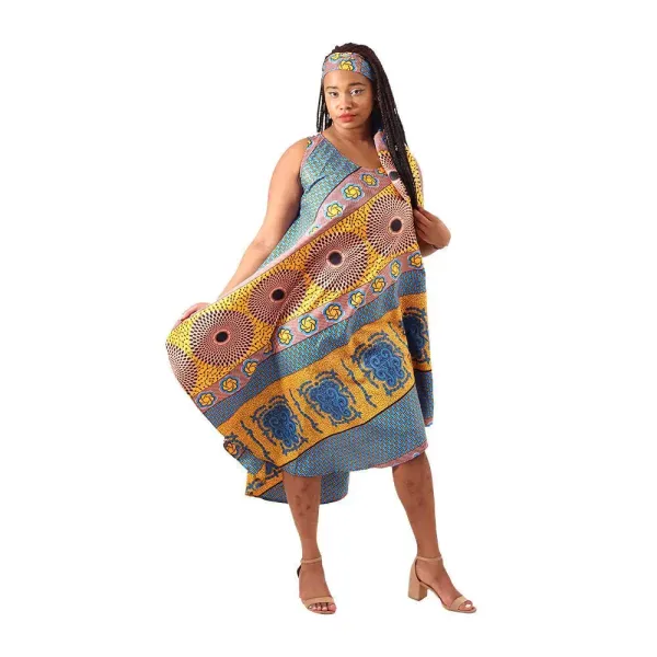 Bring bold beauty and breezy comfort to your wardrobe with our Sun Mosaic Umbrella Dress. Featuring a rich mix of traditional African patterns in vibrant hues, this sleeveless dress is designed with a flattering scoop neckline and an airy, asymmetrical hemline that moves with effortless grace.
