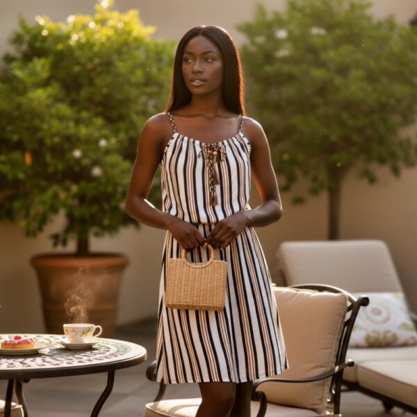 This tan striped summer dress is the perfect blend of comfort and flattering structure. Designed with a braided halter neckline and a soft elastic waist, it gently defines your shape while allowing comfortable stretch and movement.