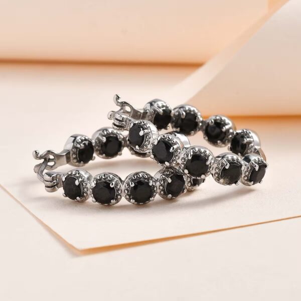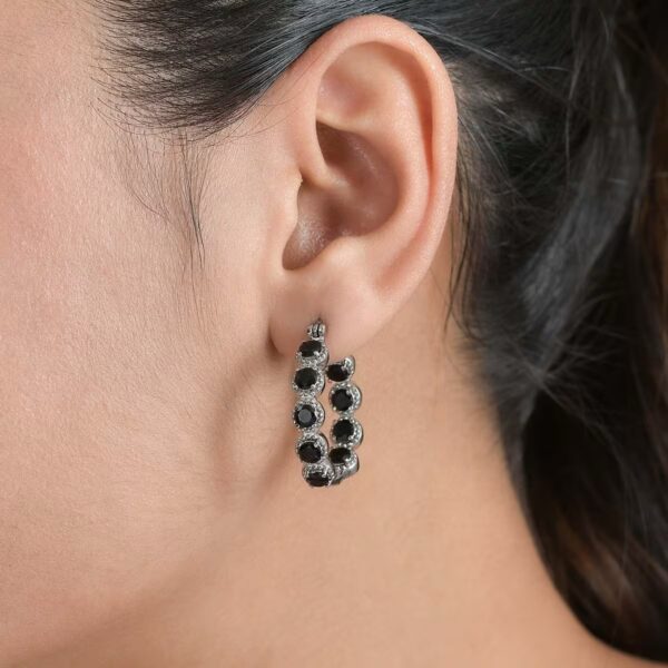 Elevate your jewelry collection with these Genuine Thai Black Spinel Inside-Out Hoop Earrings, featuring 18 round-cut black spinel gemstones totaling 4.15 carats. Designed in a full inside-out setting, these hoops deliver bold 360° brilliance with every movement.