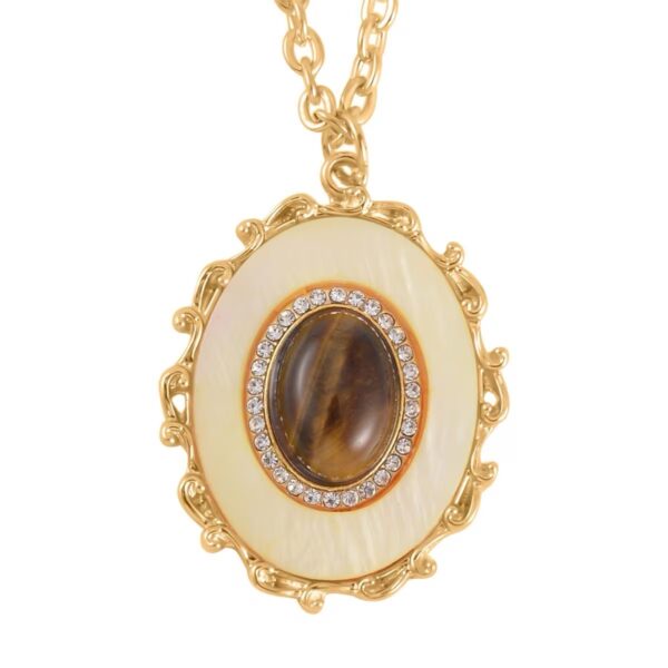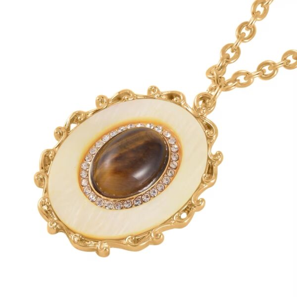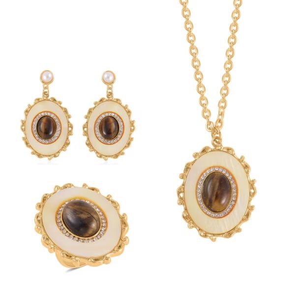 Elevate your collection with this Tiger’s Eye 3-piece jewelry set featuring a coordinating necklace, earrings, and ring. Designed with genuine oval Tiger’s Eye gemstones, creamy shell accents, and sparkling Austrian crystals, this set blends earthy richness with refined goldtone detail.