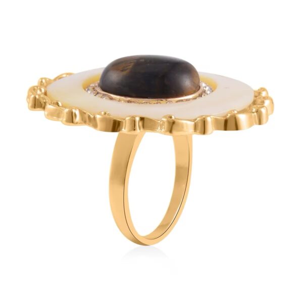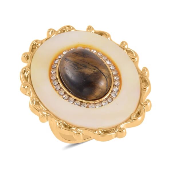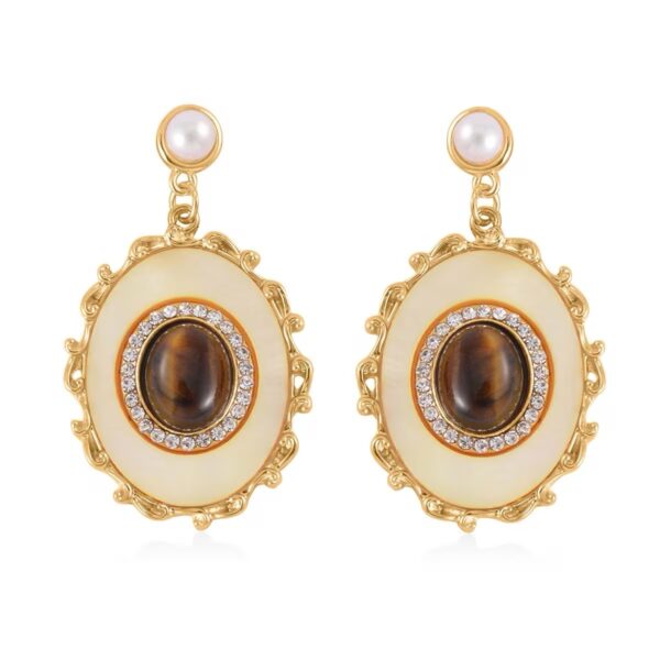 The warm golden-brown bands of Tiger’s Eye create natural depth and dimension. Each gemstone is framed with luminous shell inlay and a halo of crystals for balanced elegance.