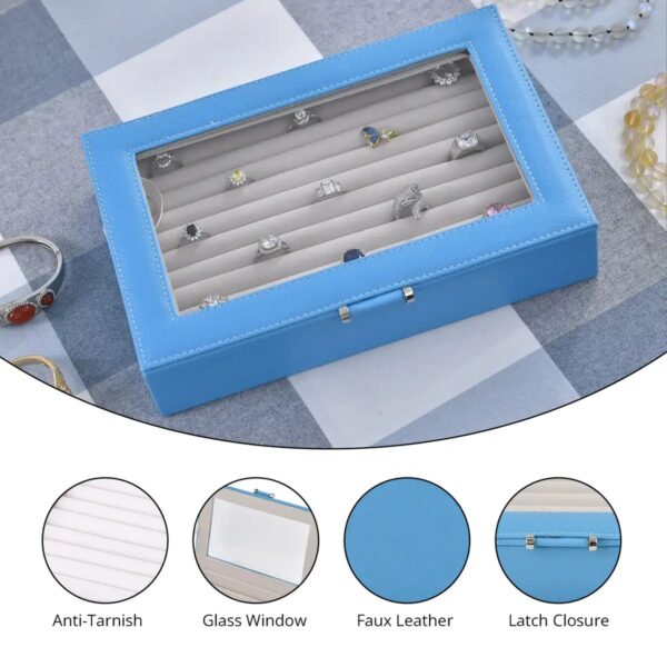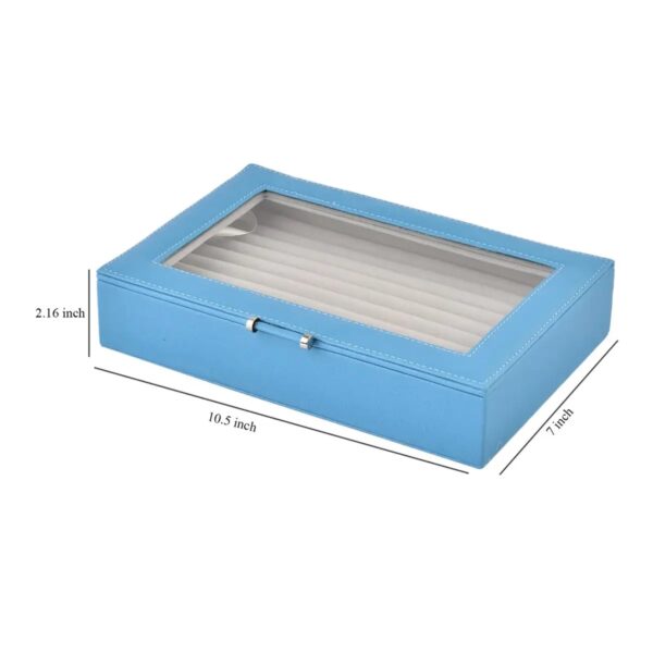 Store and display your jewelry in this turquoise faux leather ring and earring box. Designed with a clear glass window, this case allows you to view your collection while keeping it protected from dust.