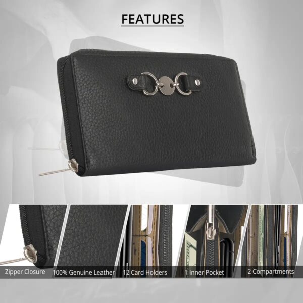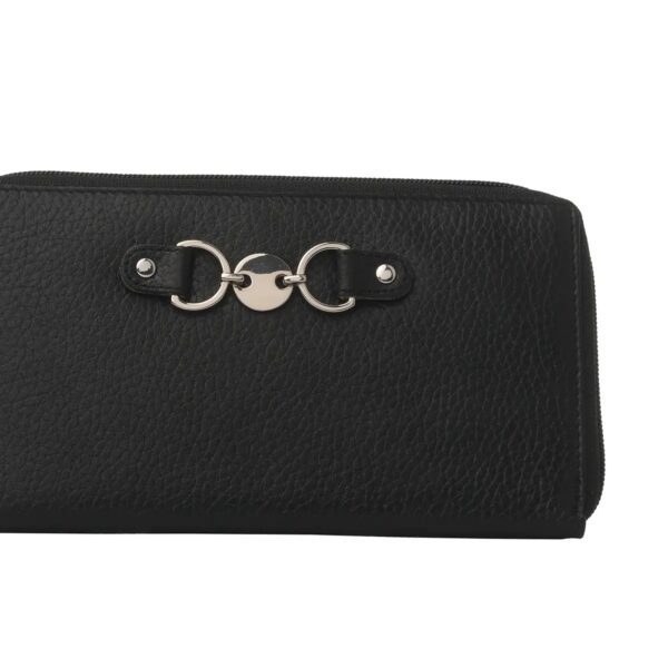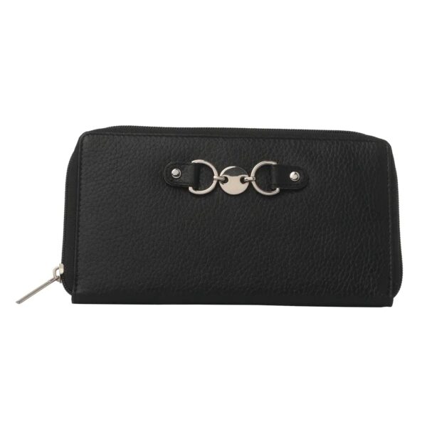 Crafted from 100% genuine pebbled leather, this zip-around wallet offers a timeless solid black finish accented with a polished front buckle detail for subtle elegance.