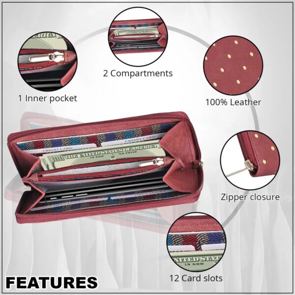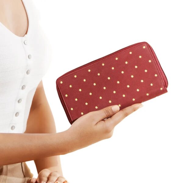❤️ Union Code Burgundy Polka Dot Genuine Leather RFID Zip Wallet (7.5”)