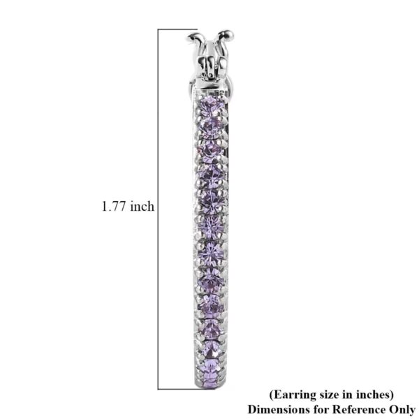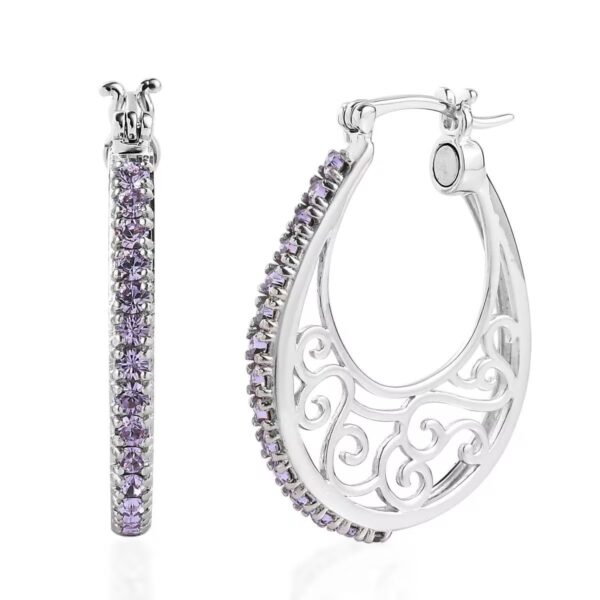 Elevate your jewelry collection with these Violet Austrian Crystal Filigree Hoop Earrings, crafted with 30 prong-set violet crystals arranged along a graceful teardrop silhouette. The delicate scrollwork cutout design adds vintage-inspired elegance, while the platinum-plated finish delivers brilliant shine and refined polish.