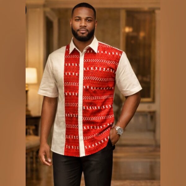 The rich red Ankara pattern creates a powerful contrast against the soft neutral cotton base, delivering a refined look that is both stylish and culturally inspired. Lightweight and breathable, this shirt is designed for comfort while maintaining a sharp, polished appearance.