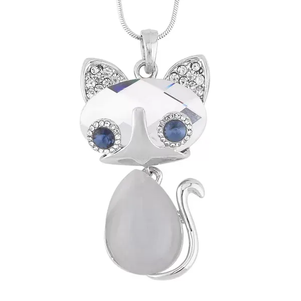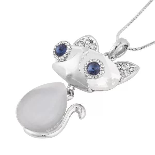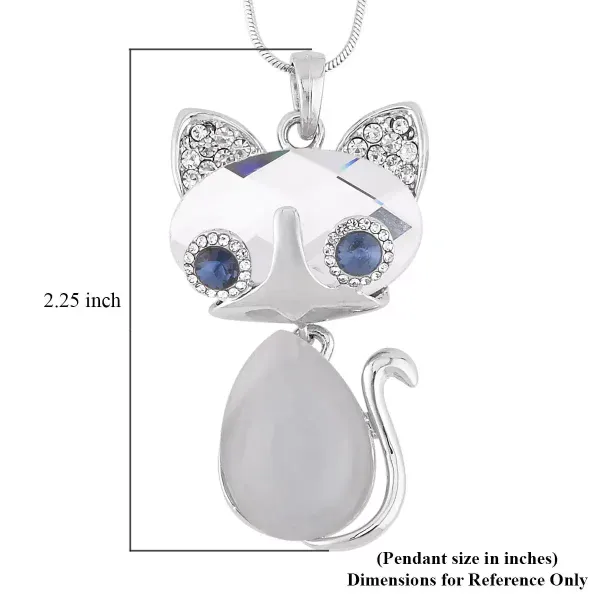 Crystal Cat Pendant Necklace – White Glass & Blue Austrian Crystals | Silvertone | Adjustable 20–30 Inch Chain | $26.99