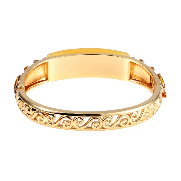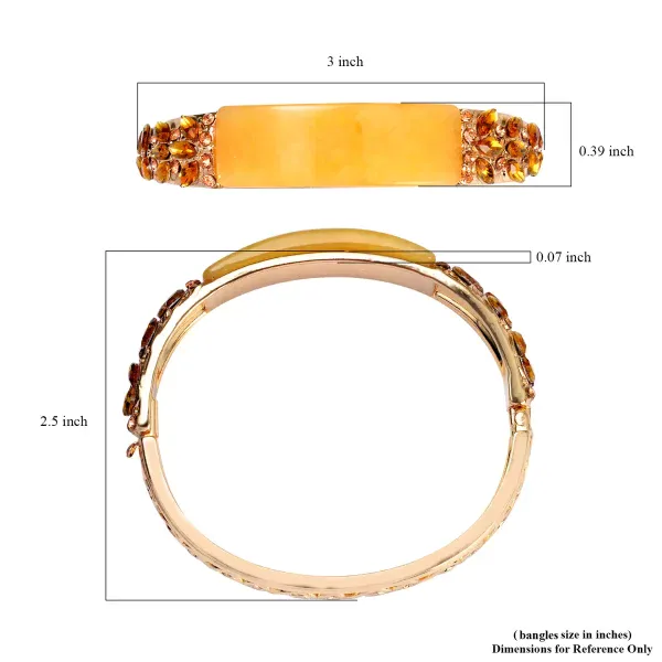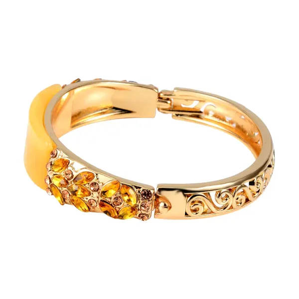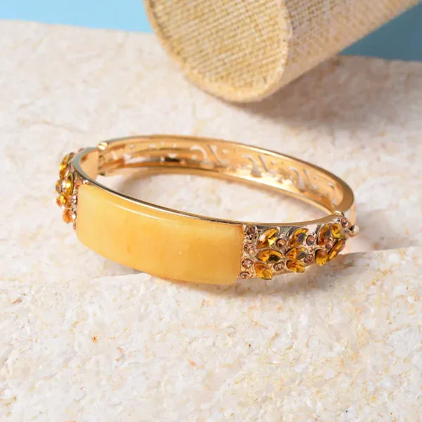 The Golden Bloom Bangle features a luminous oval-cut yellow aventurine centerpiece framed by marquise champagne glass accents and shimmering Austrian crystals. Designed with vintage-inspired openwork detailing and a secure hinged closure, this bracelet blends heirloom elegance with modern wearability.
