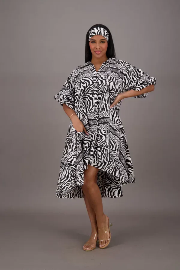 Wildly Elegant Zebra Print High-Low Dress with Matching Headwrap – One Size (Fits Sizes 1XL – 3XL)