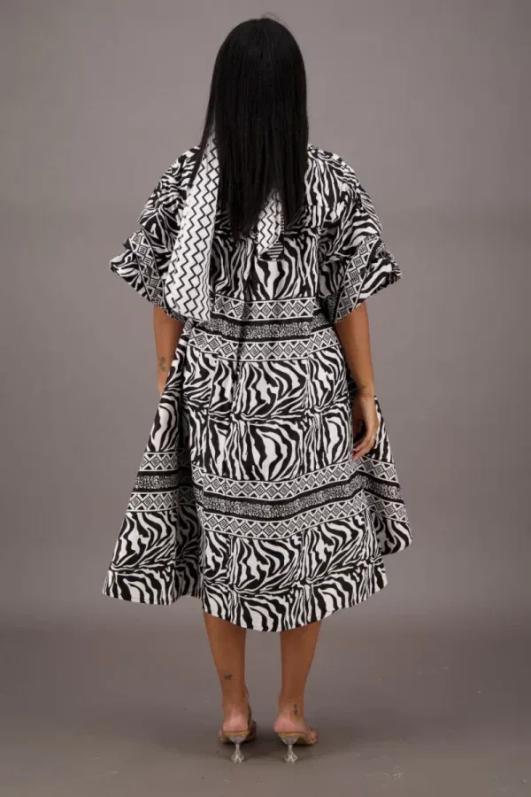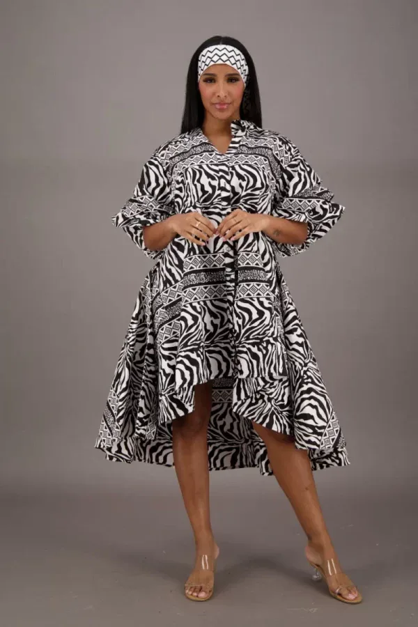 Unleash your inner style icon with the Wildly Elegant Zebra Print Dress, a bold blend of African-inspired design and contemporary flair. Featuring a dramatic black-and-white zebra pattern accented with tribal geometric prints, this high-low hem dress commands attention from every angle.